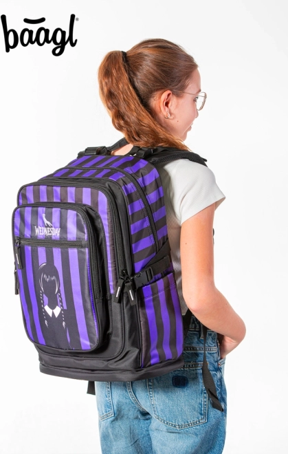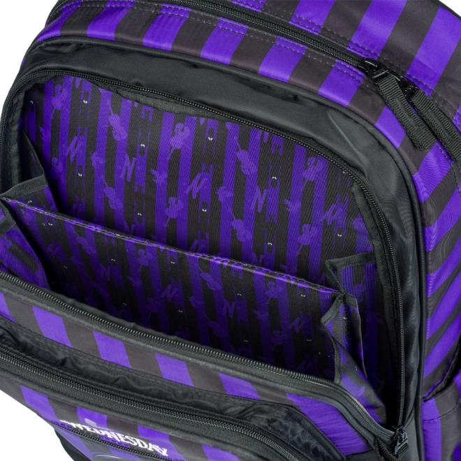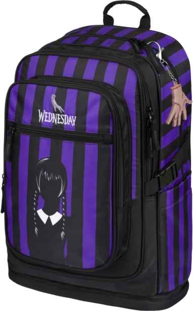 Lo zaino scolastico della linea CUBIC ispirato al tema WEDNESDAY offre schienale ergonomico sagomato, basso peso 1,2 kg e capienza 29 l. Tre scomparti con organizer e tasca per notebook da 15", elementi riflettenti per la sicurezza e resistente materiale idrorepellente lo rendono una scelta ideale per la scuola e il tempo libero.