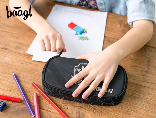 Elegante astuccio scolastico con tema WEDNESDAY NEVERMORE di BAAGL, offre una struttura robusta, un'aletta interna ribaltabile per un'organizzazione ordinata e una tasca con cerniera oltre a una tasca per l'orario. Scelta ideale per gli studenti che desiderano un astuccio pratico e resistente senza contenuto.