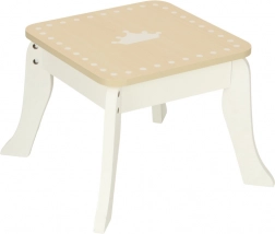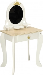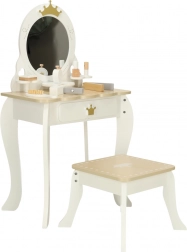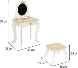 Nella confezione è incluso anche uno sgabello per sedersi comodamente. Il prodotto è interamente realizzato in legno levigato, rivestito con vernici atossiche, in un elegante design bianco e oro che incanta come decorazione della cameretta.