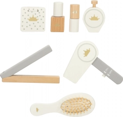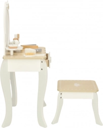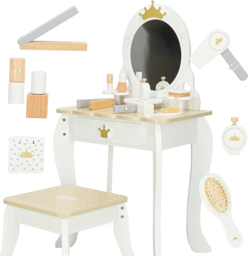 La toeletta è dotata di un grande specchio rotondo, mensole e un cassetto per gli accessori cosmetici, oltre a uno sgabello pratico. Sono inclusi accessori come pettine, asciugacapelli, piastra per capelli, palette di ombretti, profumo, smalto per unghie e rossetto. Tutti i cosmetici sono finti, quindi non c’è rischio di disordine.