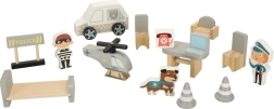 - Dotazione completa: stazione, personaggi di poliziotto e ladro, auto della polizia, elicottero, cane, coni, arredi e accessori.