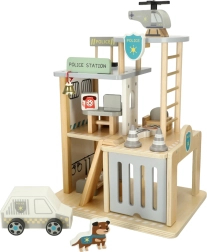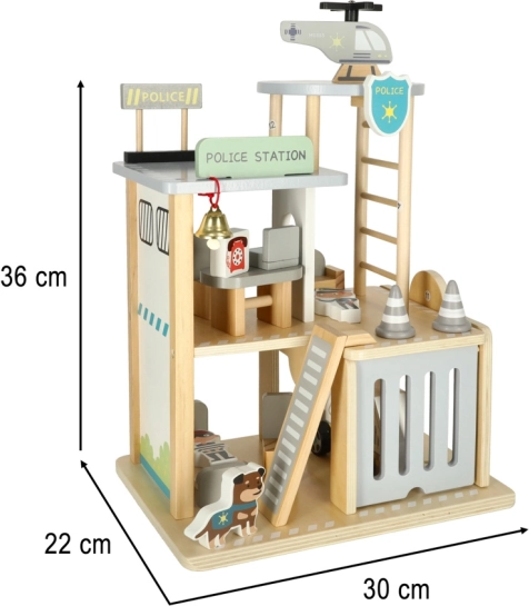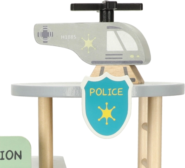 Scoprite il complesso di polizia in legno per piccoli tutori dell’ordine: stazione a tre piani con garage, cella, ufficio e pista di atterraggio per elicottero. Il set è realizzato in legno di alta qualità e offre ore di gioco creativo, sviluppa la motricità fine e favorisce il gioco di ruolo. Il design minimalista in legno naturale si adatta perfettamente alla cameretta.