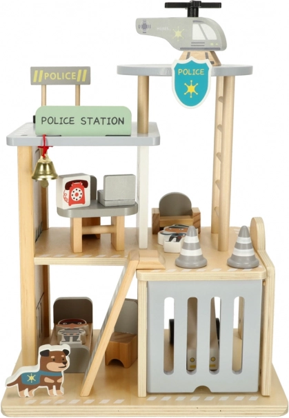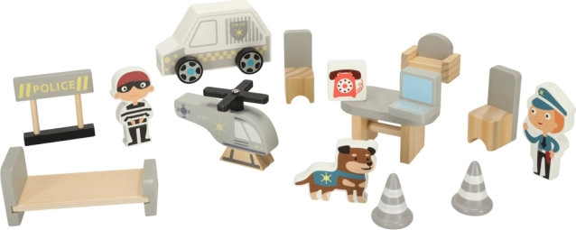 Questo set in legno, curato nei dettagli, trasporta i bambini nel mondo dei soccorsi. Al piano terra si trovano il garage per l’auto della polizia e la cella per il ladro, al centro l’ufficio del comandante e sul tetto l’eliporto per interventi rapidi. Il legno finemente levigato garantisce una manipolazione sicura e una lunga durata del giocattolo.