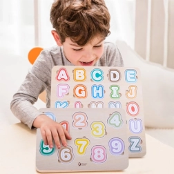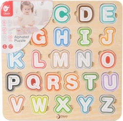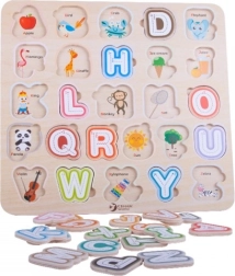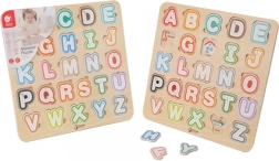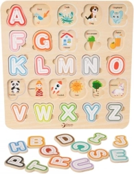 Questo alfabeto in legno di qualità, dalle dimensioni di 30 × 30 cm, supporta i primi passi verso la lettura e la scrittura. I pezzi colorati rimovibili vengono inseriti nelle forme corrispondenti, allenando la coordinazione occhio–mano e la percezione spaziale. Grazie alle immagini sotto le lettere, i bambini si familiarizzano in modo ludico anche con le paroline inglesi.