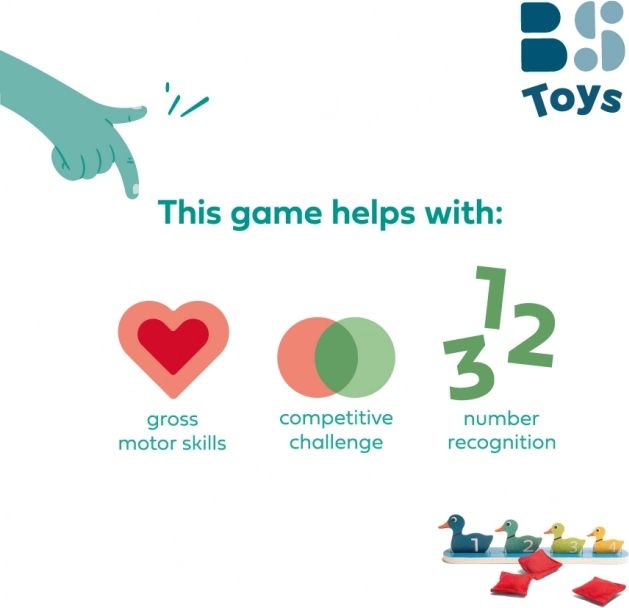 Gioco di abilità divertente e semplice per 1–4 giocatori dai 3 anni. Mettete le anatre in fila e cercate di farle cadere lanciando piccoli sacchetti. Ideale per il divertimento in famiglia e le feste per bambini – sviluppa la motricità grossolana, il pensiero strategico e offre una competizione amichevole.