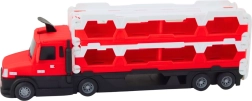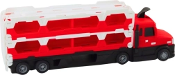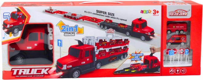 Scopri il divertimento 2 in 1 – un grande autotrasportatore rosso che, una volta aperto, si trasforma in una pista da corsa lunga 211 cm. Include effetti luminosi e sonori, 2 macchinine dei pompieri in scala 1:64 e 7 segnali stradali per un gioco creativo e l’apprendimento delle regole del traffico.
