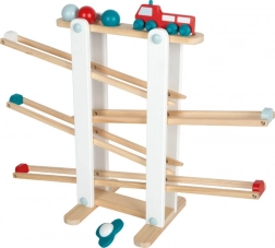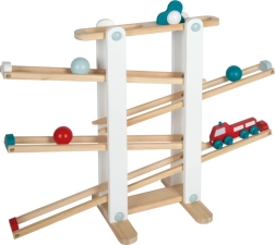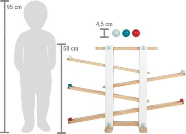 Questa grande pista a biglie in legno Small Foot offre ai bambini continue sorprese e la gioia di osservare le biglie e la macchinina scendere da un piano all'altro. Il legno naturale, combinato con colori vivaci, ha un aspetto moderno e senza tempo, integrandosi alla perfezione in ogni cameretta. La lavorazione stabile in legno massello garantisce lunga durata e gioco sicuro.
