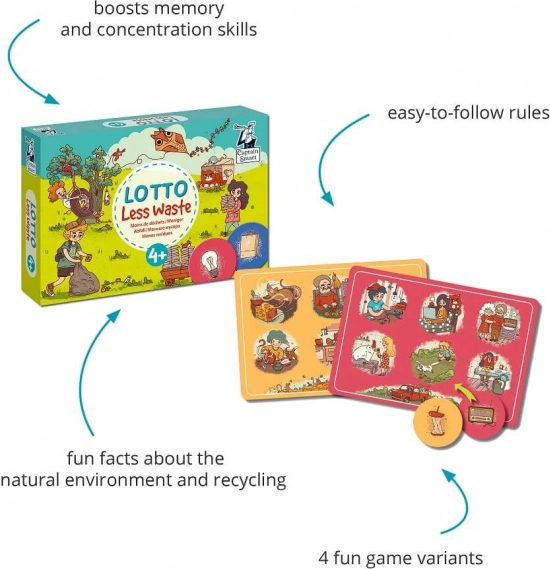 Dai una nuova vita ai rifiuti e insegna ai bambini cosa appartiene a plastica, carta, vetro, rifiuti organici ed elettronici. Il gioco Captain Smart loto – pianeta pulita è semplice e divertente per 1–6 giocatori dai 4 anni, con illustrazioni simpatiche e quattro varianti di difficoltà. L’obiettivo è abbinare i gettoni ai luoghi corretti sulle plance, potendo parlare delle immagini e sviluppare naturalmente il vocabolario.