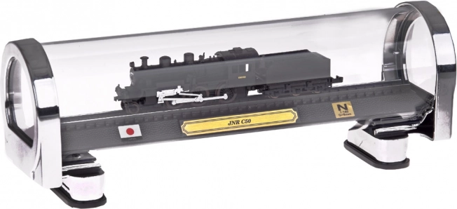 Modello dettagliato della locomotiva a vapore JNR C50 in scala 1:160, alloggiato in un'elegante vetrina cilindrica trasparente con pads antiscivolo. Il plastica spessa e resistente protegge da danni meccanici, mentre il coperchio cristallino mette in risalto i dettagli accurati del modello sulla base a binari con etichetta informativa.