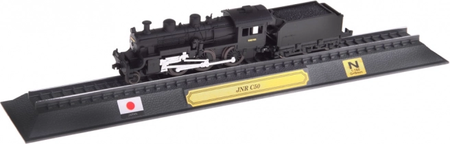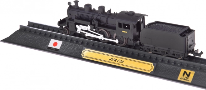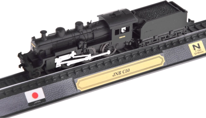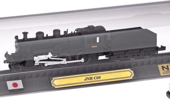 Modello dettagliato della locomotiva a vapore JNR C50 in scala 1:160 con elementi realistici della carrozzeria e del telaio su base a binari.