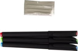 Il set include 3 pennarelli colorati e una pasta modellabile che fissa gli stencil al foglio. In questo modo si evita lo scorrimento e si garantiscono linee pulite senza sbavature.