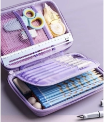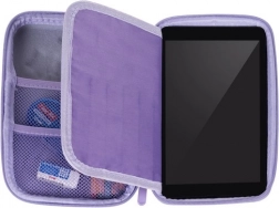 L'organizzazione interna studiata offre due ampi scomparti separati da un'aletta protettiva, due tasche in rete con elastico per i piccoli oggetti e passanti per 6 matite, pastelli o penne. Sotto l'aletta c'è spazio sufficiente anche per un tablet fino a 7"; l'aletta protegge lo schermo dai graffi. L'astuccio ricopre quindi il ruolo di organizer scolastico e di pratica custodia da viaggio.