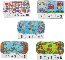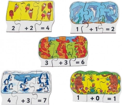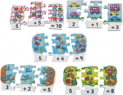 Questo unico set di puzzle in legno è uno strumento ideale per i piccoli matematici. Ogni uno dei 30 pezzi del puzzle mostra immagini che corrispondono al numero nella parte inferiore. I bambini devono collegare correttamente sempre 3 pezzi per creare la risposta giusta a un semplice problema matematico. Il puzzle offre: