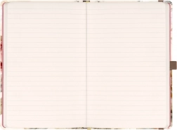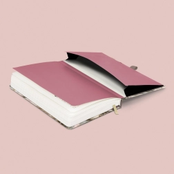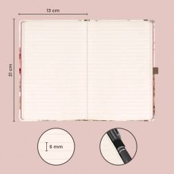 Elegante taccuino NOTIQUE con motivo di fiori color cipria nel pratico formato 13 × 21 cm, offre 172 pagine puntinate su carta gialla, copertina rigida, chiusura con elastico, passante per penna e tasca interna – ideale per diario, appunti e pianificazione.