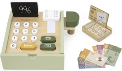 La cassa in legno nel piacevole colore verde è un ottimo gioco educativo per bambini dai 3 anni. Offre elementi funzionali come cassetto estraibile, tasti, scanner, terminale per carta e rotolo di carta, che riproducono fedelmente una cassa reale. È inclusa anche una mini lavagnetta bifacciale per annotare i conti.