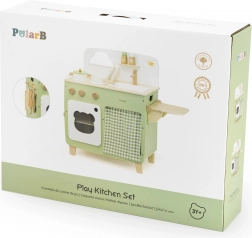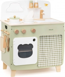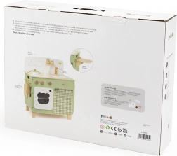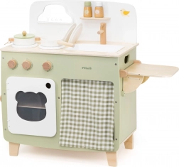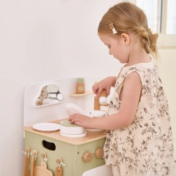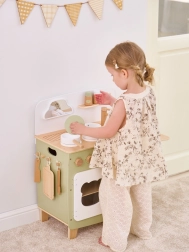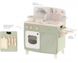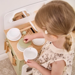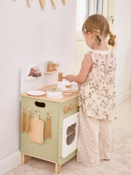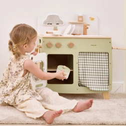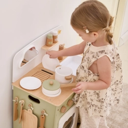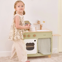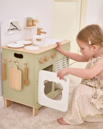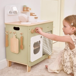 Una cucina per bambini dal design naturale nei toni del legno e del verde offre un'esperienza di gioco realistica. Grazie alla solida struttura in legno, alle manopole girevoli, al lavello e al forno, i piccoli chef potranno divertirsi per ore in modo sicuro e creativo. Il pratico piano laterale ribaltabile amplia lo spazio per tagliare o apparecchiare, mentre l'armadietto con tendina custodisce tutti i tesori.