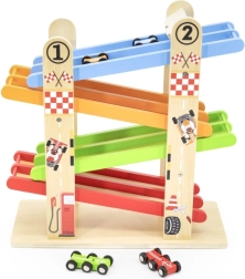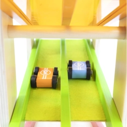 Questa robusta pista in legno offre una rampa doppia per avvincenti gare tra due macchinine in contemporanea. I bambini saranno attratti dai colori vivaci e dai campanelli posizionati al traguardo, che suonano all’arrivo dei veicoli. La struttura è pensata per le piccole mani – bordi lisci, base stabile e materiali resistenti garantiscono lunga durata e gioco sicuro.
