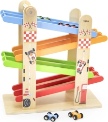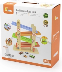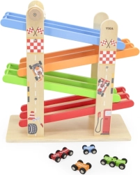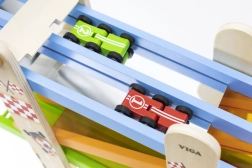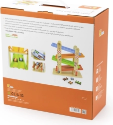 La divertente pista da corsa in legno con doppia corsia di Viga offre ai bambini gare senza fine e gioia del movimento. Le due corsie parallele permettono di organizzare duelli tra due macchinine contemporaneamente, accolti alla fine da campanelli al traguardo. Realizzata in legno laccato resistente, senza spigoli vivi e con colori atossici, è sicura per le manine. Inclusi 4 veicoli colorati in due versioni (a 4 e a 6 ruote) che favoriscono lo sviluppo di motricità, coordinazione occhio–mano e introducono in modo giocoso ai principi della fisica.