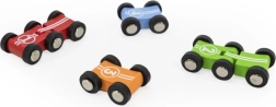 Legno laccato, colori atossici e spigoli arrotondati. Inclusi quattro veicoli colorati: due a quattro ruote e due a sei ruote.