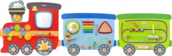 Ogni vagone offre un tipo di attività diverso: la locomotiva rossa con ingranaggi, ruota a mulino e specchietto, il vagone blu con xilofono e labirinto di perline e il vagone verde con pista del trenino scorrevole e blocchi girevoli con motivi di luoghi del mondo. Grazie alla varietà degli elementi i bambini non si annoiano e sviluppano in modo naturale le competenze secondo l’approccio Montessori.