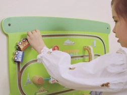 Il trenino interattivo da parete trasforma ogni stanza in un giocoso centro educativo. Tre pannelli separati si montano facilmente alla parete e fanno risparmiare spazio, mentre i colori vivaci e gli elementi tattili invitano all’esplorazione. I bambini allenano la presa, la coordinazione occhio–mano e la comprensione di causa ed effetto, il tutto in sicurezza grazie alla precisa lavorazione in legno e alle vernici atossiche.
