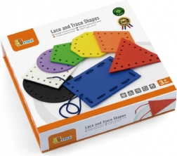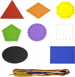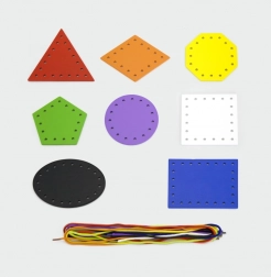 Otto forme colorate e otto laccetti motivano a classificare, abbinare e nominare. I bambini imparano colori e forme geometriche in modo divertente.