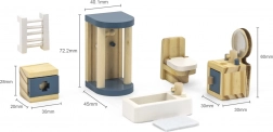 I mobili in miniatura sono dimensionati per le comuni casette; i singoli pezzi si dispongono facilmente. Misure di esempio: lavabo 3 × 3 × 6 cm, armadietto 2 × 3 × 2,8 cm, doccia 4 × 4,5 × 7,22 cm.