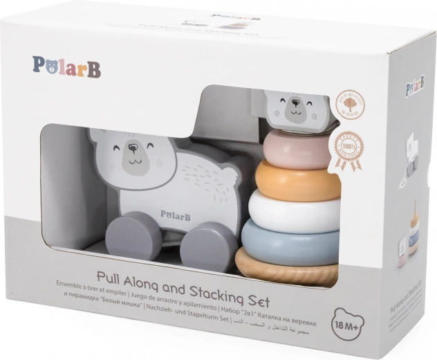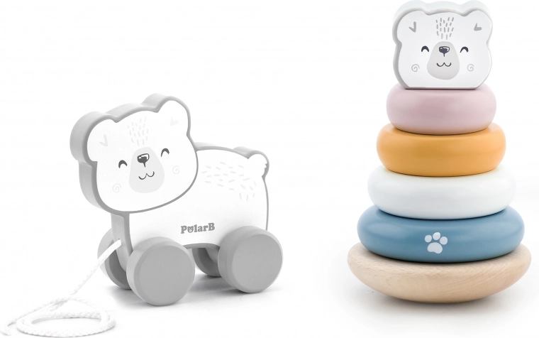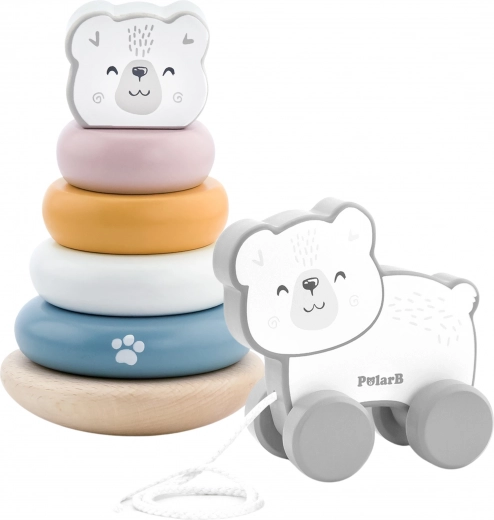 Un set elegante del marchio Viga della collezione PolarB che include due giocattoli in legno dai toni pastello: una piramide educativa con orso polare e un adorabile orsetto da trainare. Sostiene la motricità fine, il pensiero logico, la coordinazione mano–occhio e l’apprendimento dei colori, offrendo allo stesso tempo divertimento quotidiano.