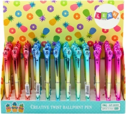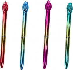 Elegante penna a sfera con corpo dorato e ananas decorativo all'estremità, che unisce eleganza e funzionalità. Scrive con inchiostro blu dal flusso scorrevole e con punta da 0,7 mm, ideale per appunti quotidiani e come idea regalo. Disponibile in finitura dorata con accenti colorati: rosa, blu, rosso, verde.