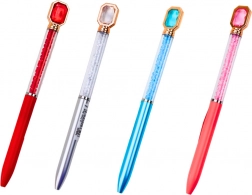 Elegante penna a sfera con corpo trasparente riempito di brillantini e un delicato cristallo all'estremità. Inchiostro blu per una scrittura fluida e scorrevole, ideale per l'uso quotidiano e come idea regalo. Disponibile in mix di colori del corpo (rosa, blu, rosso, argento).