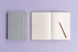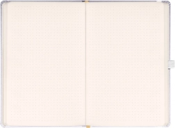 Lo stile del quaderno Notique Balacron si distingue per il materiale di rivestimento di alta qualità, estremamente resistente ai danni esterni. Il colore argento trasmette professionalità e un look senza tempo, mentre la disposizione puntinata delle pagine offre flessibilità per scrivere, disegnare e fare bullet journaling.