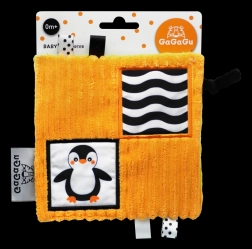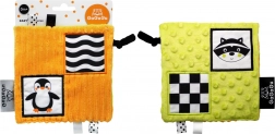 Il design double-face offre due illustrazioni accattivanti – pinguino e procione – e tanti dettagli da esplorare: nastrini, asole in peluche ed un’etichetta più grande per una presa più facile. Questi elementi favoriscono la coordinazione occhio–mano e l’esercizio della motricità fine.