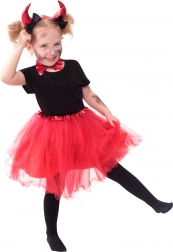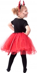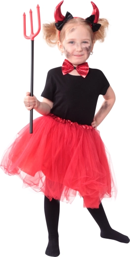 Dolcissimo costume per piccole diavolette dai 3 ai 7 anni con soffice gonna TUTU in tulle e codino da diavolo, comoda vita elastica e accessori come cerchietto con corna e papillon per il collo. Ideale per Halloween, carnevale e feste a tema.