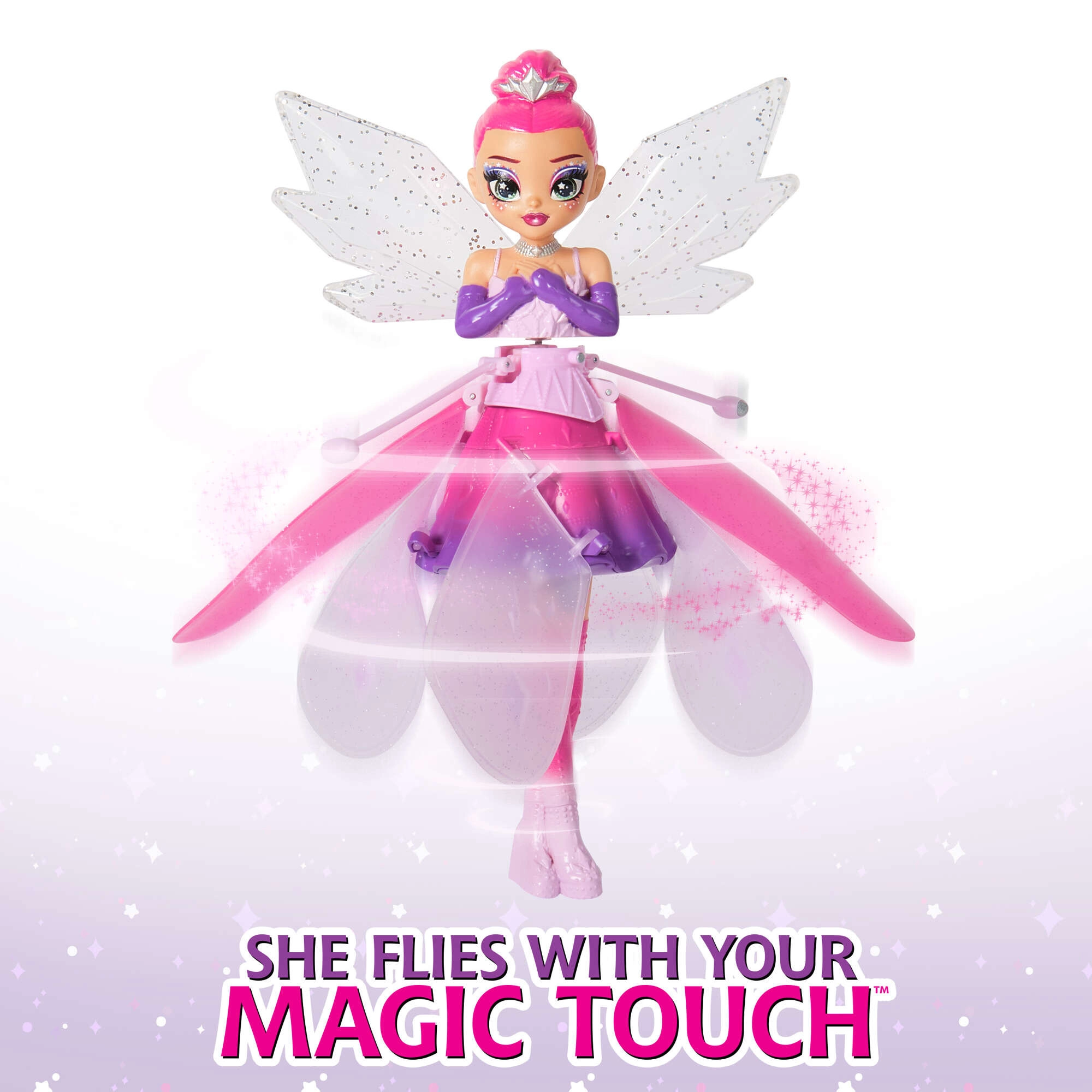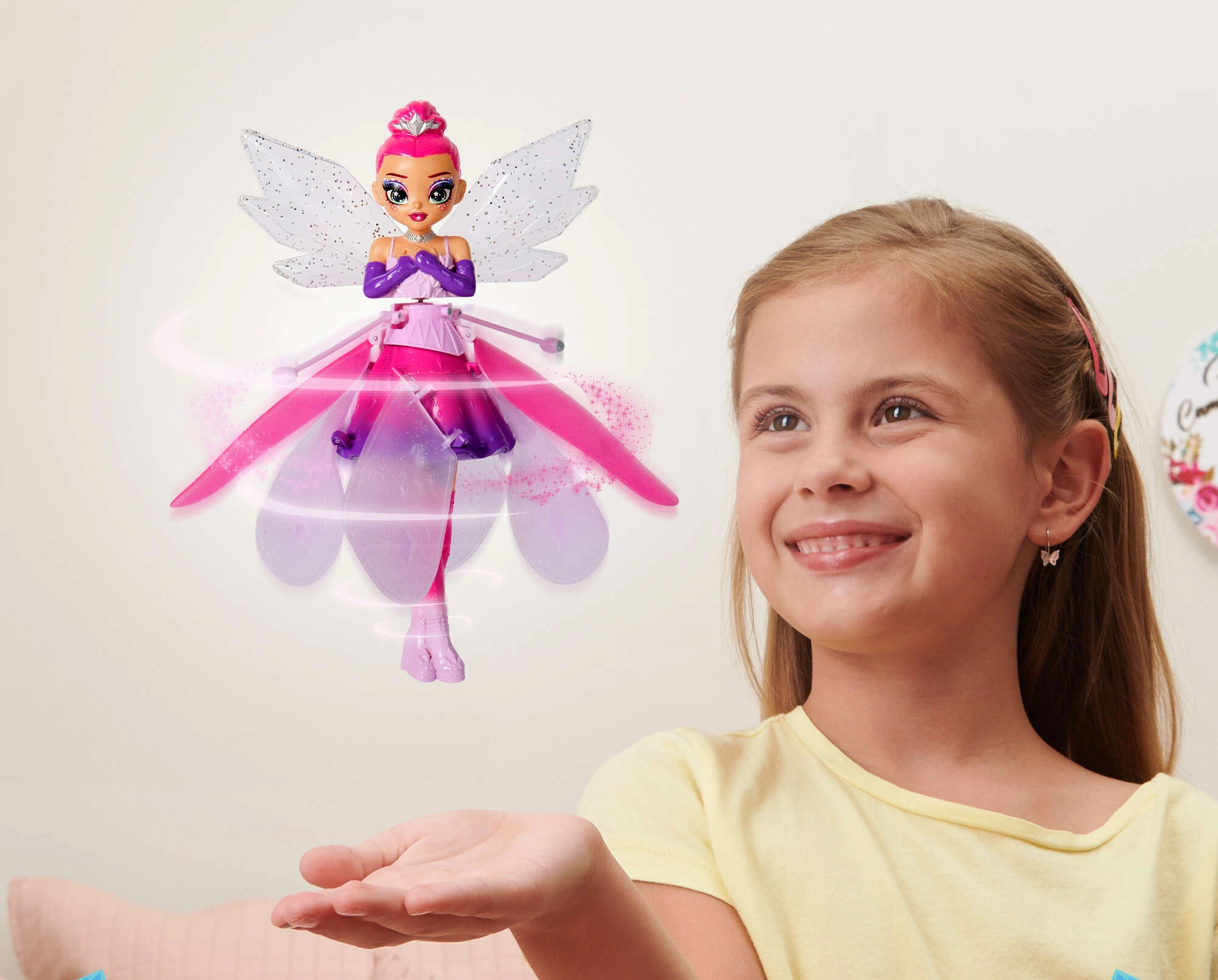 Il magnifico design con ali cristalline, vestito scintillante e capelli arcobaleno la rende un regalo perfetto per i bambini che amano bambole, action figure e il mondo fantastico delle fate. Grazie alla ricarica USB è pronta a spiccare di nuovo il volo in un attimo: basta posarla sulla piattaforma o lasciarla andare delicatamente dalla mano.