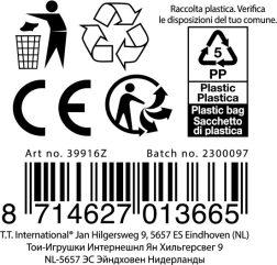Ogni set è confezionato in un sacchetto trasparente che facilita il trasporto e lo stoccaggio degli animaletti. Dimensioni della confezione: 9 x 9 x 1 cm.
