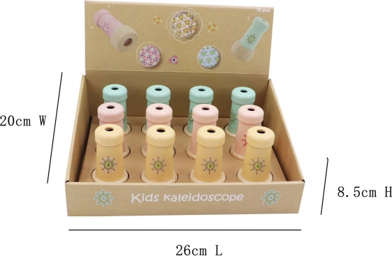 Scopri il mondo magico con il caleidoscopio in legno nei colori blu, giallo e rosa. Divertimento perfetto per bambini e adulti.