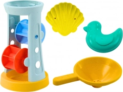 - mulino a sabbia con due ruote, setaccio e imbuto, paletta, rastrello, 2 formine (conchiglia, paperella)