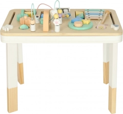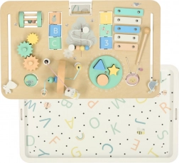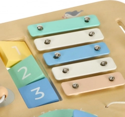Xilofono, incastro di forme, ingranaggi con cursori e labirinto di perline tengono i bambini impegnati a lungo e sviluppano naturalmente motricità fine e logica.