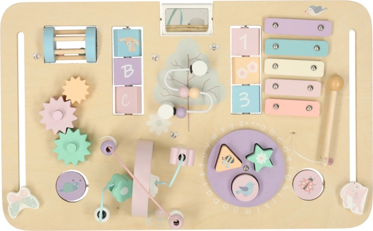 Sul piano trovi xilofono con bacchetta, labirinto con perline, elementi rotanti e scorrevoli e un inseritore di forme. Queste attività sviluppano destrezza manuale, concentrazione e immaginazione spaziale, mentre il legno e i toni delicati favoriscono un gioco tranquillo.