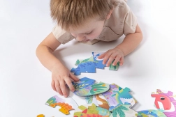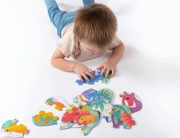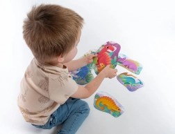Ogni dinosauro è un puzzle separato con forma semplificata. I bambini allenano la composizione mentre scoprono il mondo delle creature preistoriche.