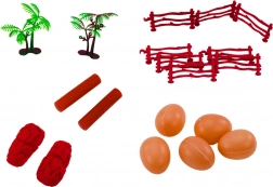 Alberelli, recinzioni e altri elementi in plastica aiutano a creare un mondo preistorico personale e sviluppano il gioco di ruolo.