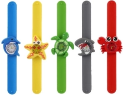 Divertente orologio per bambini con motivi di animali marini, facilita l’apprendimento dell’ora e offre un indosso confortevole. Grazie al cinturino in silicone autoavvolgente (slap) l’orologio si indossa facilmente con un solo “colpo”. Le lancette di colori diversi aiutano i bambini a leggere meglio l’ora e la batteria LR626 integrata consente l’uso immediato. Disponibili 5 motivi allegri – delfino, stella marina, tartaruga, squalo e granchio.