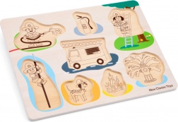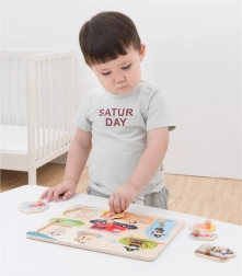 Il puzzle a incastro include otto pezzi, ciascuno con la propria fessura e maniglia per una facile presa. Sotto ogni pezzo c'è un'immagine che aiuta i bambini a trovare il posto giusto.