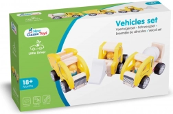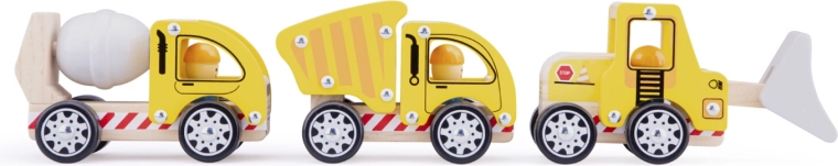 Set di tre veicoli da costruzione in legno, ideale per l'immaginazione e il gioco creativo dei bambini. Ispira la creazione di storie e racconti, sostiene lo sviluppo delle competenze motorie.