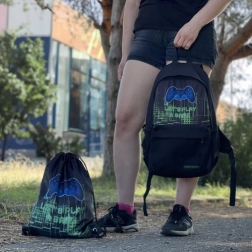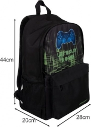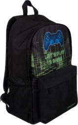 L’interno offre un ampio scomparto principale con tasca imbottita per laptop, tasca frontale con cerniera nascosta per gli oggetti piccoli e due tasche laterali in rete per borraccia o ombrello. La moderna grafica gaming con controller dona allo zaino un look originale che piacerà a tutti gli appassionati di gaming.