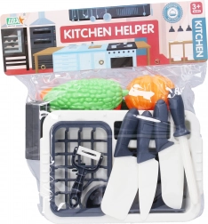 Scopri il divertimento in cucina con questo adorabile set da cucina per bambini! Questo set comprende non solo un lavandino e uno scolapiatti per giocare in modo realistico, ma anche vari strumenti da cucina come tre coltelli, un affila coltelli e un tagliere. Inoltre, include un pelapatate e diversi pezzi di cibo come la carota da tagliare a metà, il mais e la zucca, che permettono un gioco realistico.