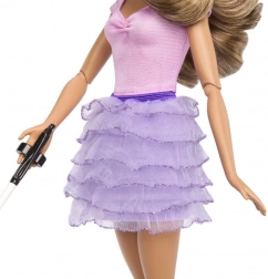 La bambola indossa una camicetta rosa e una gonna a strati lucida con scarpe lavanda.