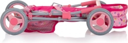 La capottina regolabile protegge la bambola; il cestino inferiore ospita accessori, biberon e giocattoli preferiti.