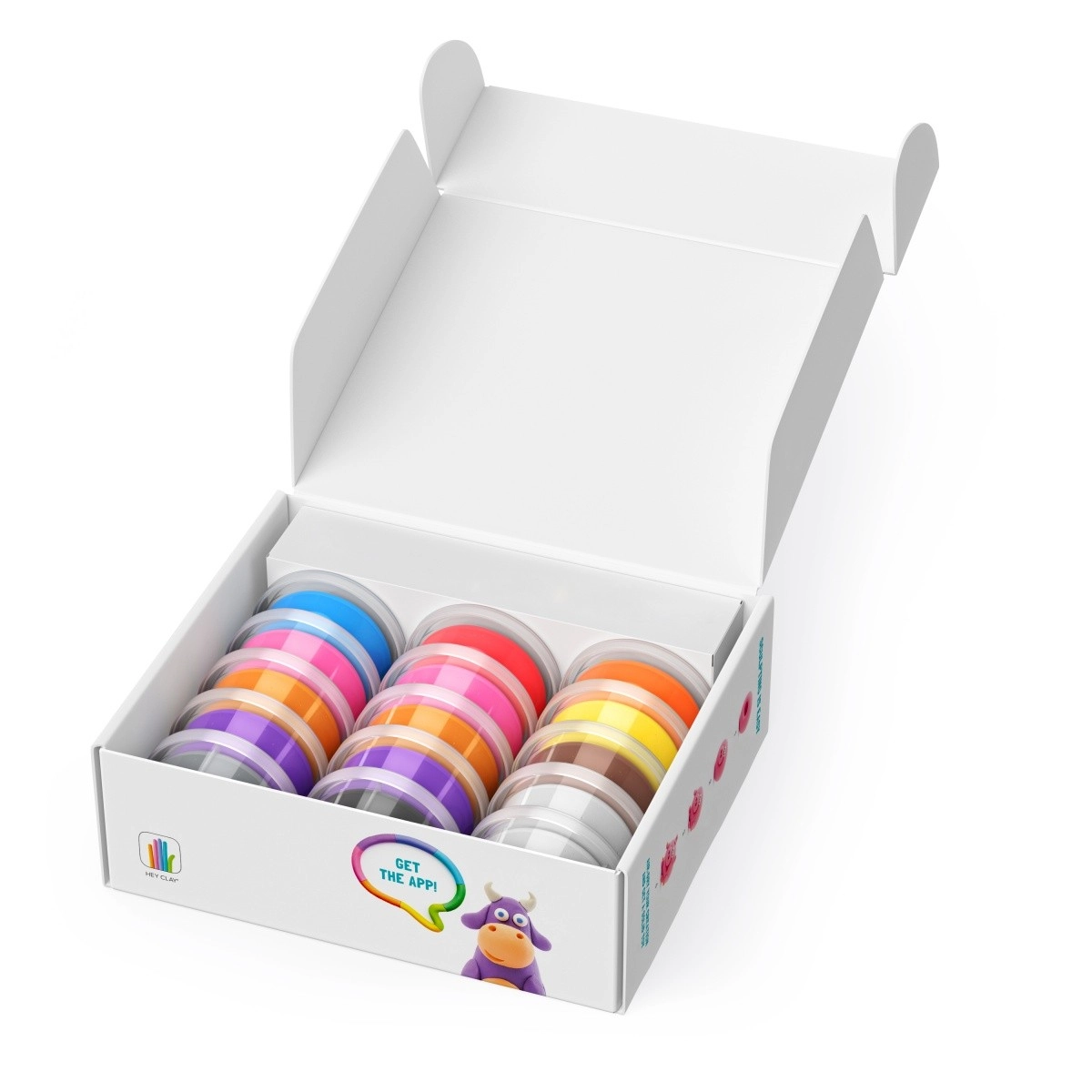 Il set include 15 vasetti di pasta morbida e una guidata digitale passo-passo nell’app per Android e iOS. Il materiale è sicuro per la pelle dei bambini e adatto al gioco ripetuto – basta riporre il materiale non utilizzato in un vasetto ben sigillato.