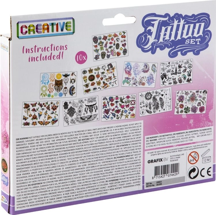 Il set di tatuaggi contiene 10 fogli con vari motivi per fantastici tatuaggi adatti a ogni occasione. Basta ritagliare il tuo tatuaggio preferito, applicarlo sulla pelle, inumidire con una spugnetta ed è fatto! Avvertenza: utilizzare solo sotto la supervisione di un adulto!